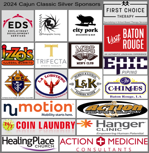 Bateman’s Ice, Brownfields Lions Club, Capitol City Produce, Chick-fil-A, Chicken Salad Chick, Coca-Cola, Community Coffee Company, Dr. John Nyboer (The NeuroMedical Center), EBR Parish Sheriff’s Office, Gorman Brothers, Highland Park Tennis Association, Kelly Elkins State Farm, McClain Trailers, McDonalds of Acadiana, National Charity League – River Road Chapter, Olinde Event Rentals, Ochsner Exceptional Abilities (employee resource group), Permobile, Price LeBlanc Lexus, Quantum Rehab, Ronnie’s Boudin & Cracklin House, Second Serve, Southeast Baton Rouge Lions Club, Southern Maid, Westport Linen Services, and World’s Finest Chocolate.
